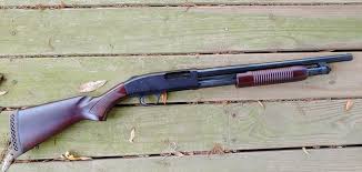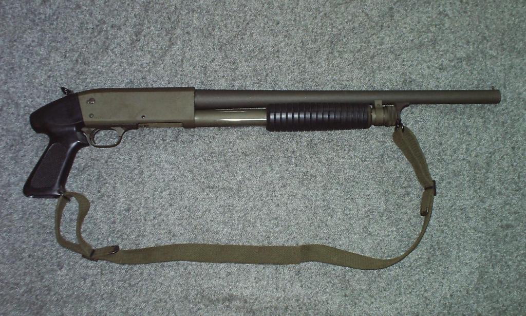 Mossberg 500 pump-action, 2+1 to 8+1 rounds, effective range at 130 ft, 12 or 20 gauge and .410 bore, 14 to 30″ barrel length